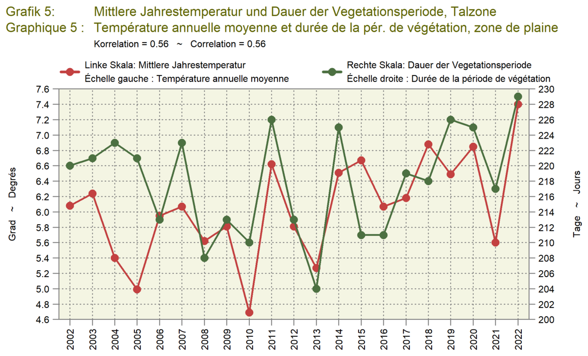 Die steigenden Temperaturen in der Schweiz verlängern die Dauer der Vegetationsperiode im Futterbau, gemessen als Abstand zwischen dem Beginn der Weide im Frühling und dem Beginn der Winterfütterung im Herbst. Vor allem die Weidenutzung im Frühling verschiebt sich mit steigenden Temperaturen im Kalender nach vorne. Pro Grad Anstieg der mittleren Jahrestemperatur wird eine Verlängerung der Vegetationsperiode von 5,8 Tagen in der Talzone und 6,8 Tagen in der Hügelzone geschätzt.