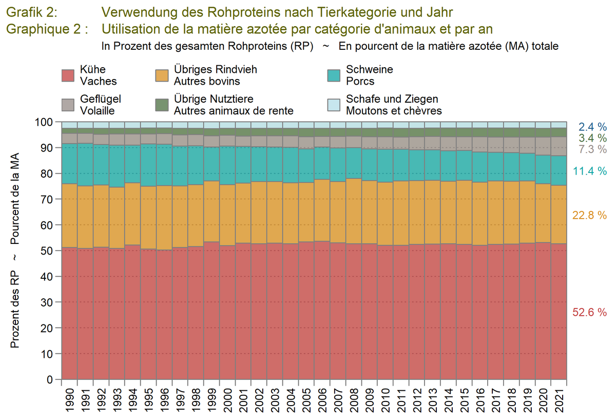 Im Jahr 2021 haben die verfügbaren Futtermittel gegenüber dem Vorjahr mit 7'773'000 Tonnen Trockensubstanz um 0,6 % zugenommen. Die marktfähigen Futtermittel sind hauptsächlich Kraftfutter, davon standen im Berichtsjahr 1'817'000 Tonnen zur Verfügung. Die nicht marktfähigen Produkte sind Grundfuttermittel, die fast ausschliesslich von den Raufutterverzehrern gefressen werden. 2021 stammten 5'956'000 Tonnen Futtermittel, d.h. 76,6 % des gesamten Verbrauches, aus dieser Kategorie. Der Anteil der Inlandproduktion am gesamten verfügbaren Futter ist 2021 auf 83,7 % gesunken. Die schlechten Wetterverhältnisse im Jahr 2021 sorgten für schwierige Produktionsbedingungen und tiefere Erträge als im Vorjahr.