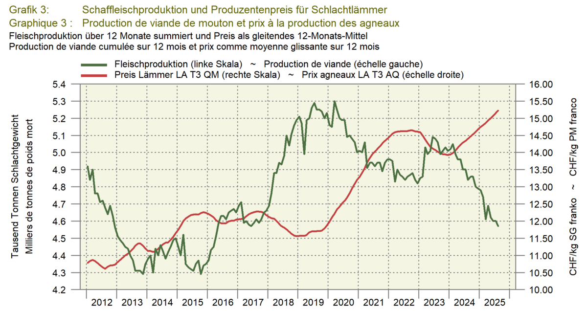 Gemessen in Grossvieheinheiten (GVE) dürfte der Nutztierbestand 2025 aufgrund der rückläufigen Rinder- und Schafbestände um ca. 1 Promille abnehmen. Die Zunahmen bei den Nutzhühnern (+1514 GVE) und den Schweinen (+444 GVE) können den Rückgang nicht kompensieren. Bei Rindern, Schafen und Ziegen ist der Rückgang der Bestände an jungen Tieren auffällig. Die Blauzungenkrankheit dürfte ein Schadfaktor sein und hat wahrscheinlich bei den Wiederkäuern zum Rückgang der Geburten geführt.