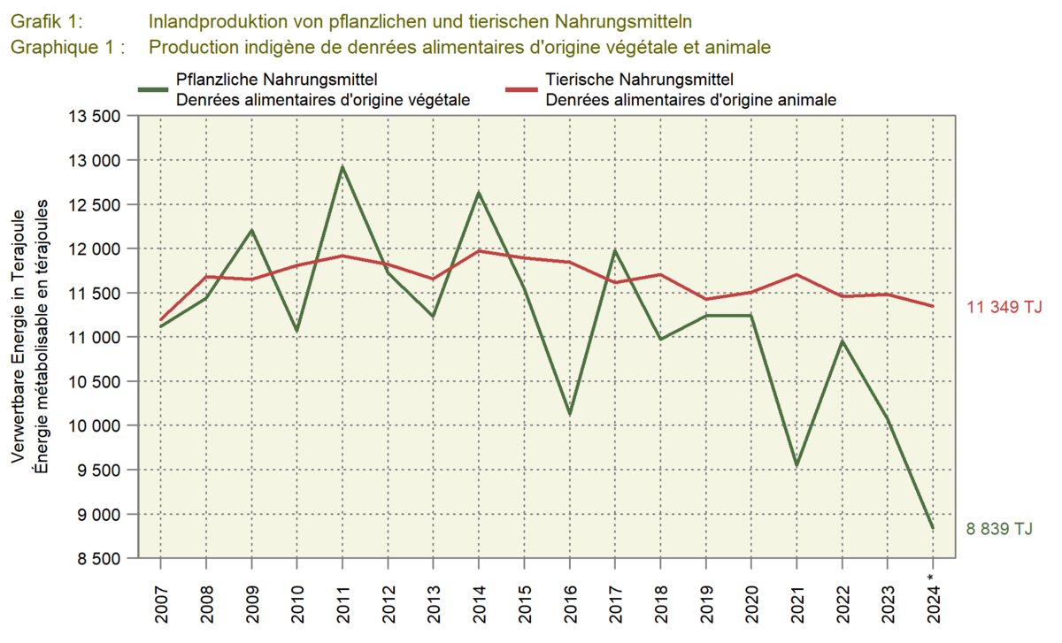 Das Jahr 2024 erwies sich erneut als sehr schwieriges Produktionsjahr für den Pflanzenbau. Auch die tierische Produktion war rückläufig im Vergleich zum Vorjahr. Insgesamt nahm die für den Menschen verwertbare Energie aus inländischen Nahrungsmitteln um 6 % ab. Eine geringe Inlandproduktion in Kombination mit erhöhten Importen führt unvermeidlich zu einem niedrigen Inlandanteil am Verbrauch (Selbstversorgungsgrad): Mit 50 % erreichte dieser 2024 einen neuen Tiefststand. Der Pro-Kopf-Verbrauch von Nahrungsmitteln nahm auch 2024 leicht ab. Ursachen dafür, insbesondere der Einkaufstourismus, werden diskutiert, ebenso wie die Beobachtung, dass der Verbrauch tierischer Nahrungsmittel, trotz vielfältiger Bemühungen, nicht weiter zurückgeht.