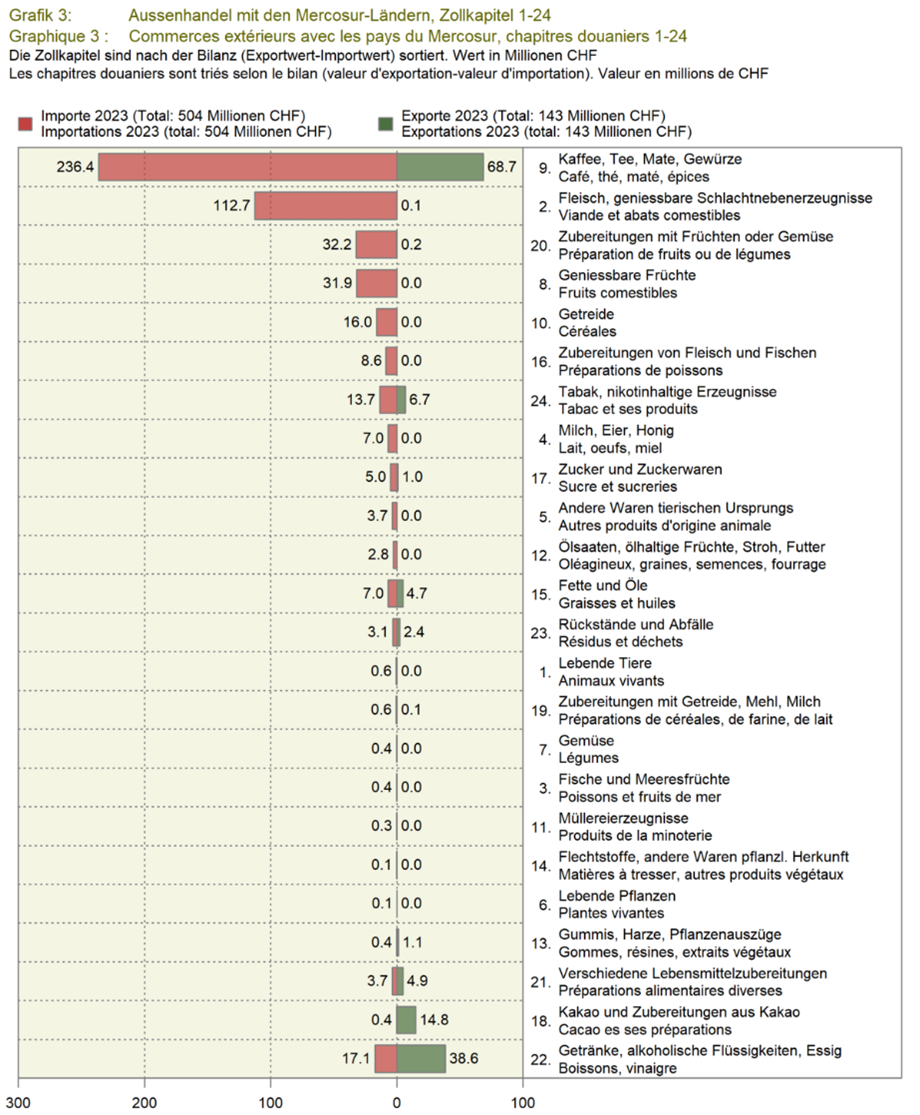 La situation est différente dans le cadre de l’accord de libre-échange avec les États sud-américains du Mercosur. Ces États disposent d’un secteur agricole très compétitif et fortement axé sur les exportations. Aujourd’hui déjà, la Suisse en importe des produits agricoles d’une valeur de plus de 500 millions de francs.