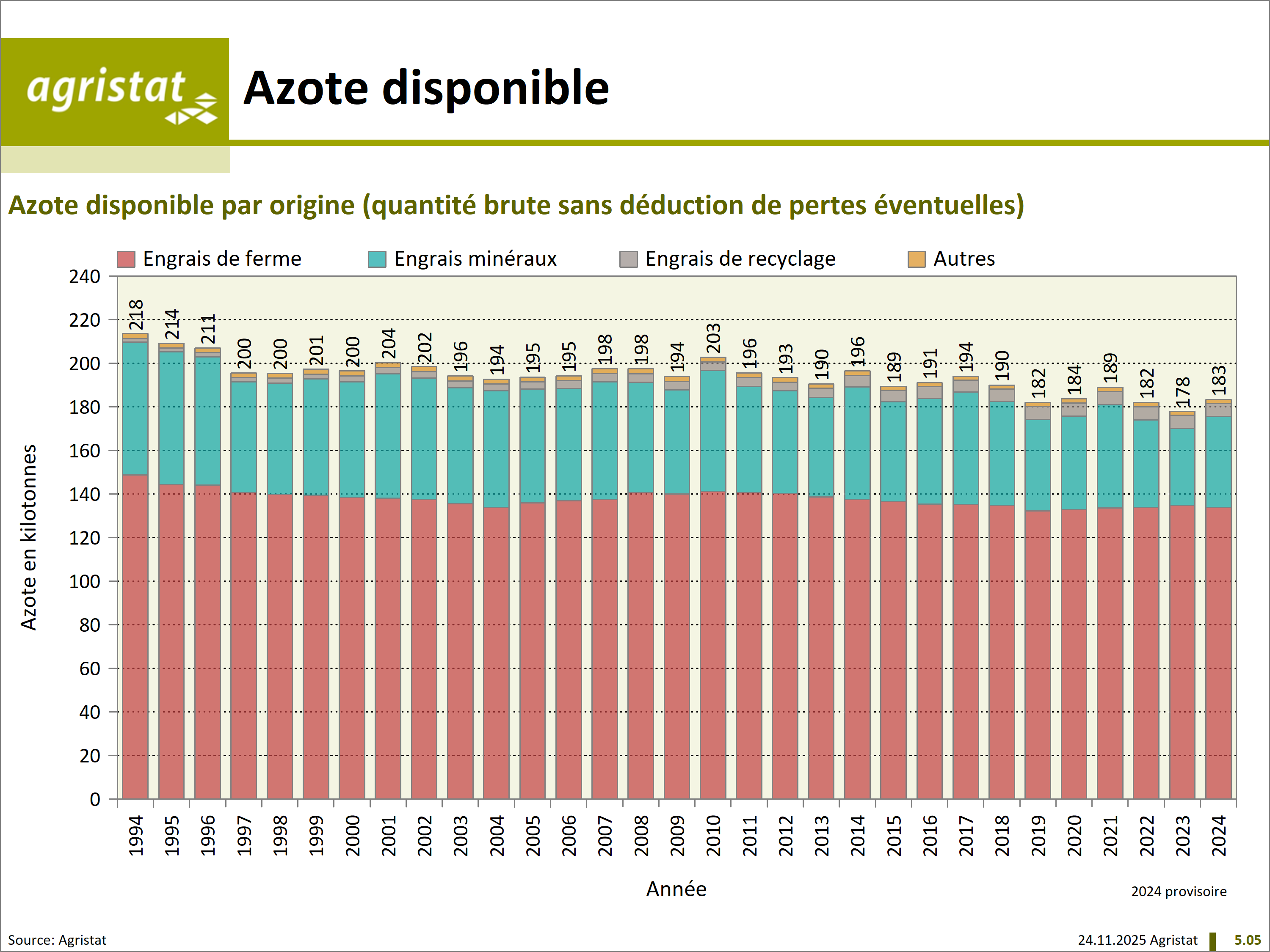 Cette section englobe des indications concernant les engrais, les produits phytosanitaires, les émissions, la production et la consommation d’énergie. Les données proviennent de diverses organisations, notamment de l’Office fédéral de l’environnement (OFEV) et de l’Office fédéral de la statistique (OFS).
