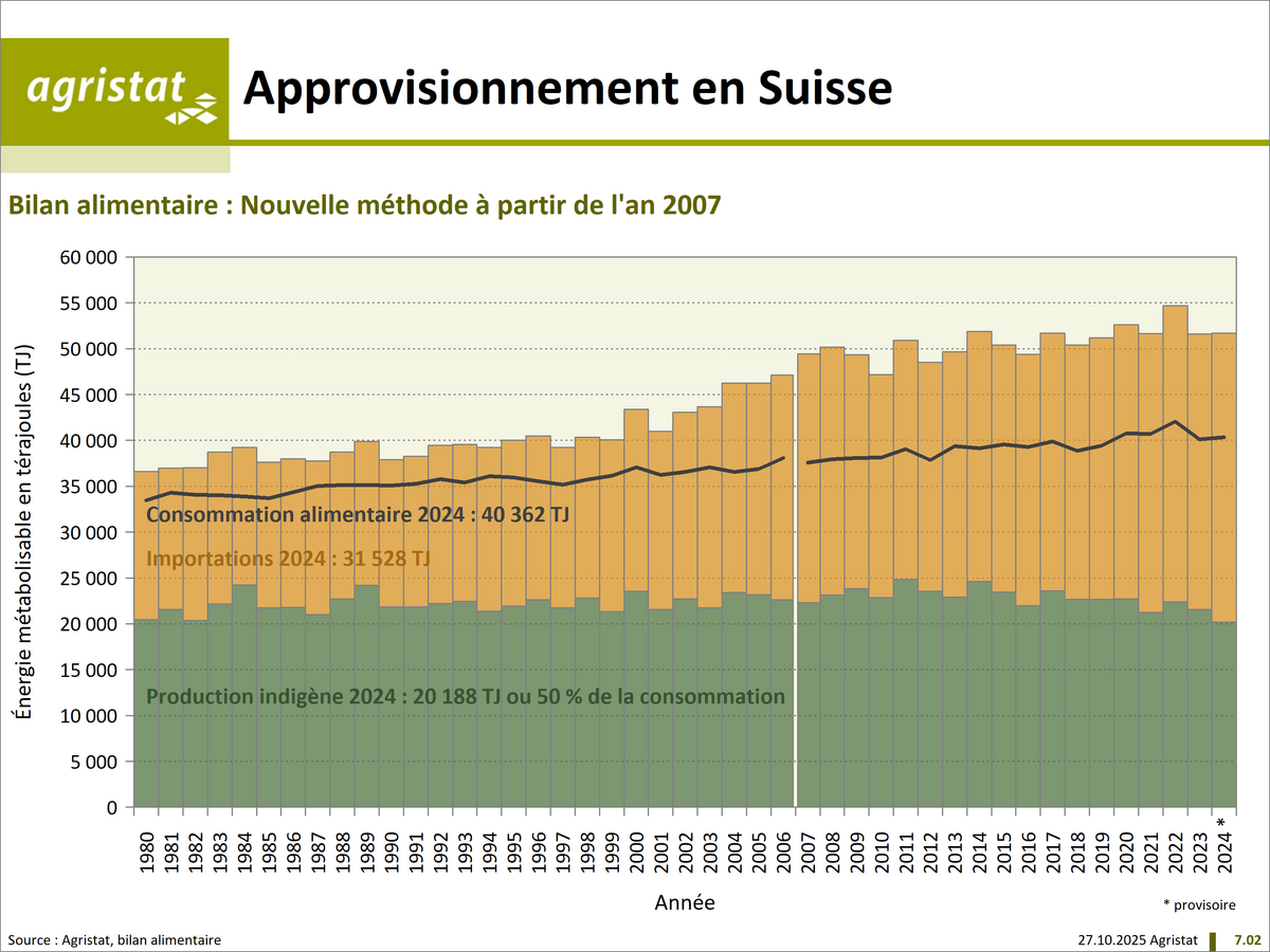 Cette section contient notamment les statistiques du bilan des denrées alimentaires établi par Agristat. Dès 2007, ce bilan est calculé sur la base de la nouvelle méthode NMB08. Il faut en tenir compte si on considère des séries temporelles. En plus, quelques statistiques provenant d’autres sources sont présentés.