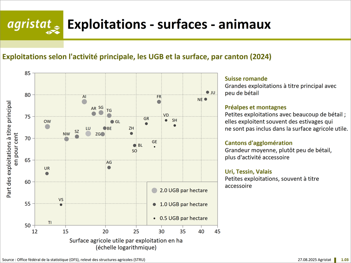 Cette section englobe les indications concernant les structures des exploitations agricoles: nombre d’exploitations, surface utile, exploitants et employés, amélioration des structures et investissements en projets de construction. Les données de cette section proviennent des recensements des exploitations agricoles et des relevés des structures agricoles de l’Office fédéral de la statistique (OFS) et d’autres statistiques de l’OFS.